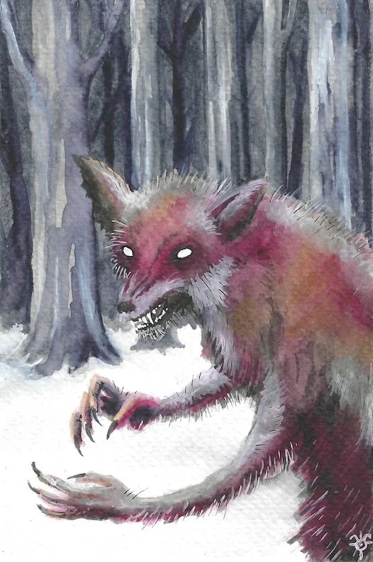 Timothy follows a forgotten path through a lonesome hollow, then climbs a ridge to find some very old cairns, and a drystone wall of unknown origin. A huge fox appears in the valley below. Human tracks, seen coming from a game trail, seemingly disappear and turn into canine tracks. Barking dogs surround the ridge. Someone is seen... after making way to the location, more canine tracks are found.